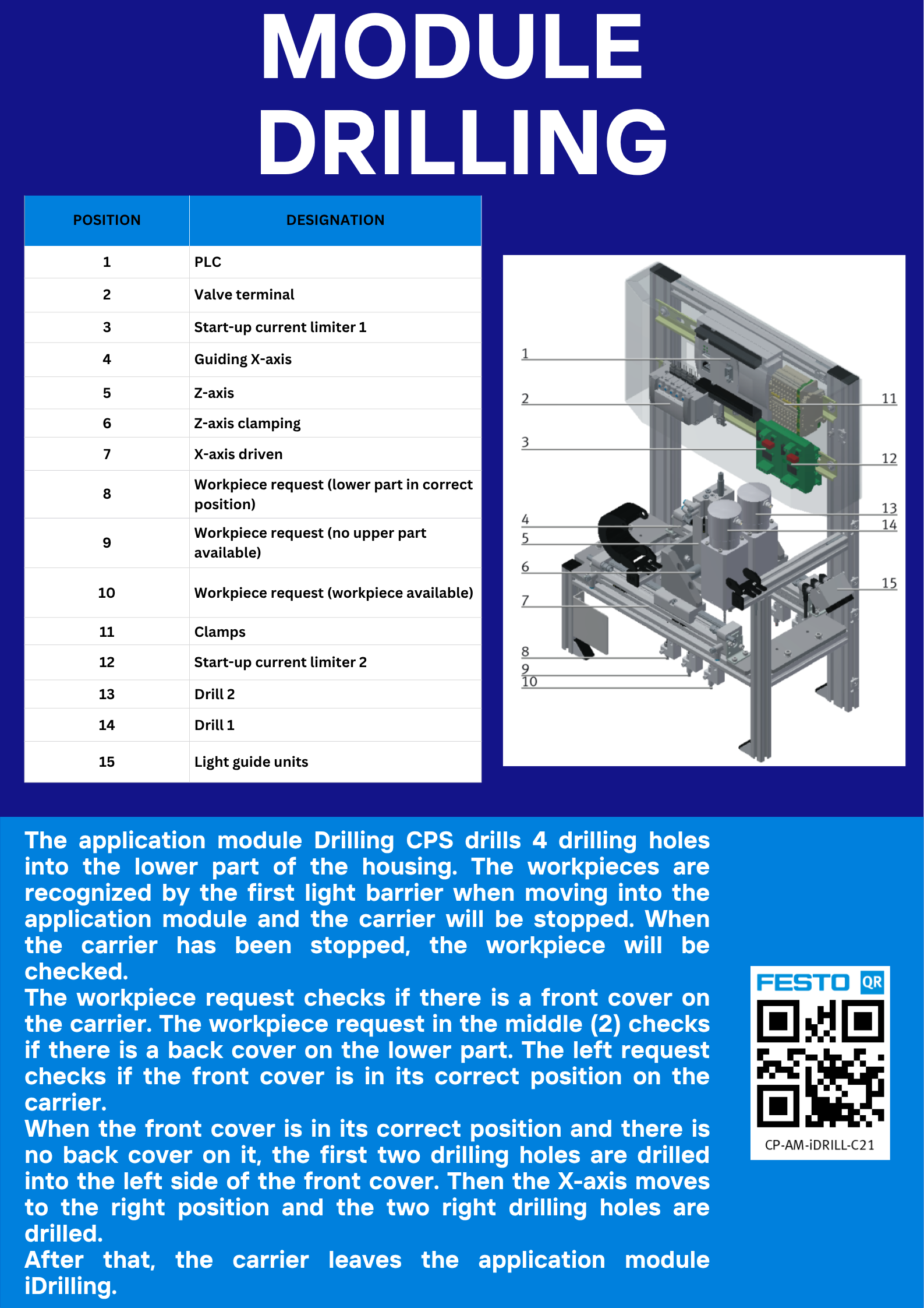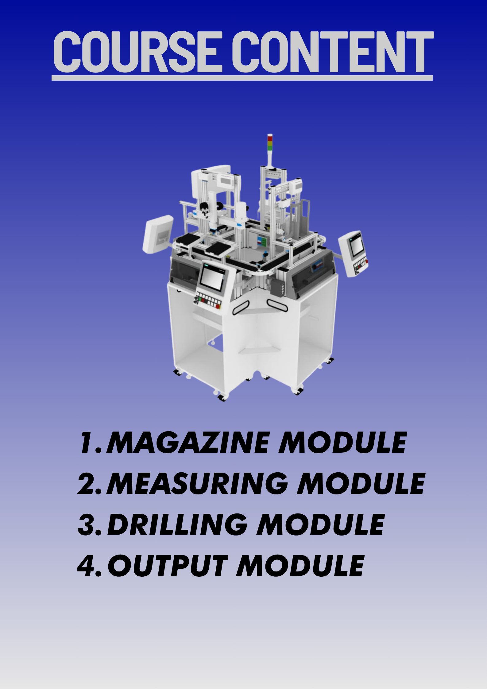Review the descriptions and functions of each module (Output, Drilling, Measuring, and Magazine) carefully, paying attention to key components and processes such as workpiece handling, measurements, and the conditions required for each module’s operation. Use this information to guide your answers based on the module's design and functionality.