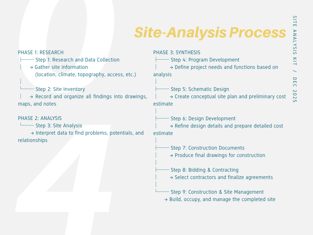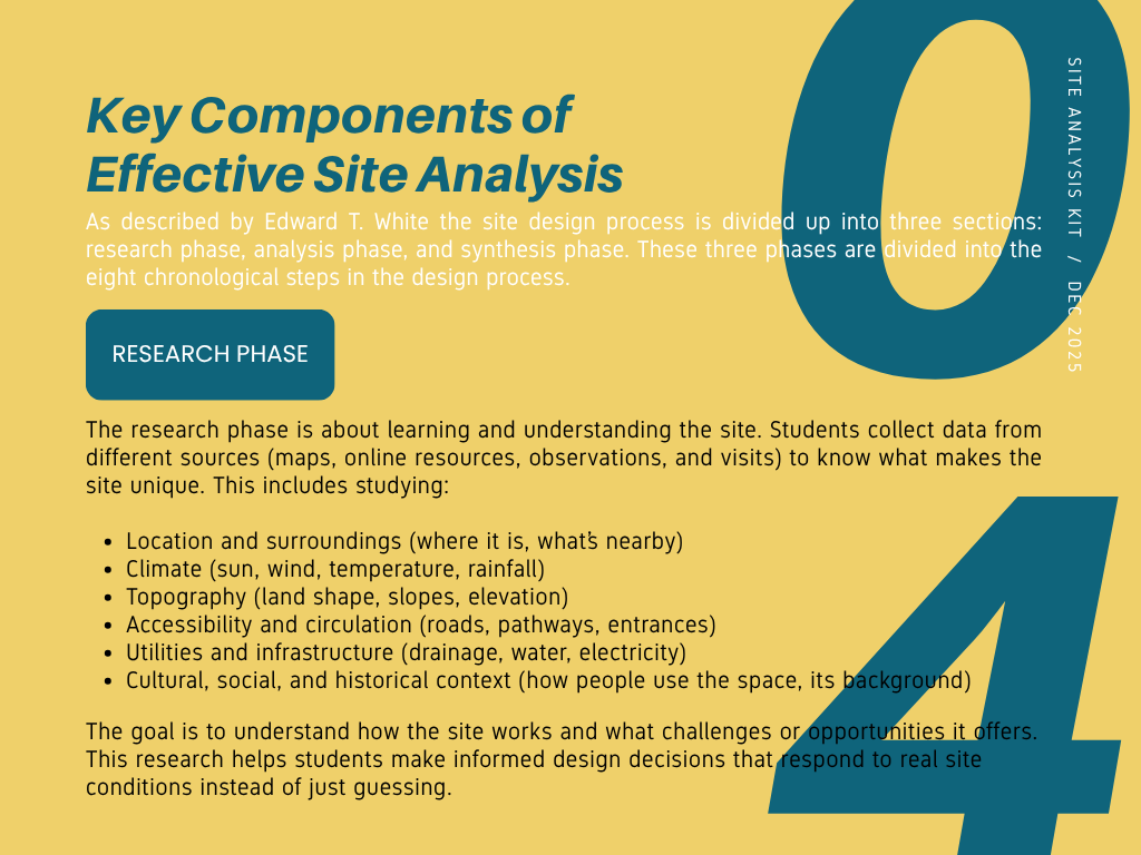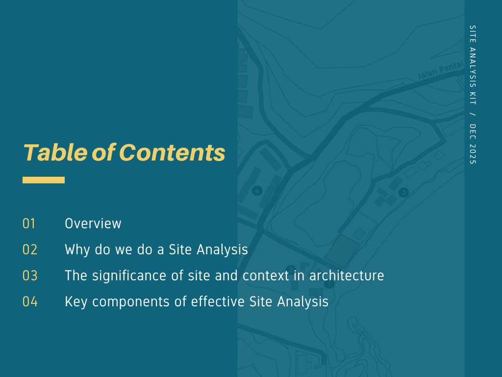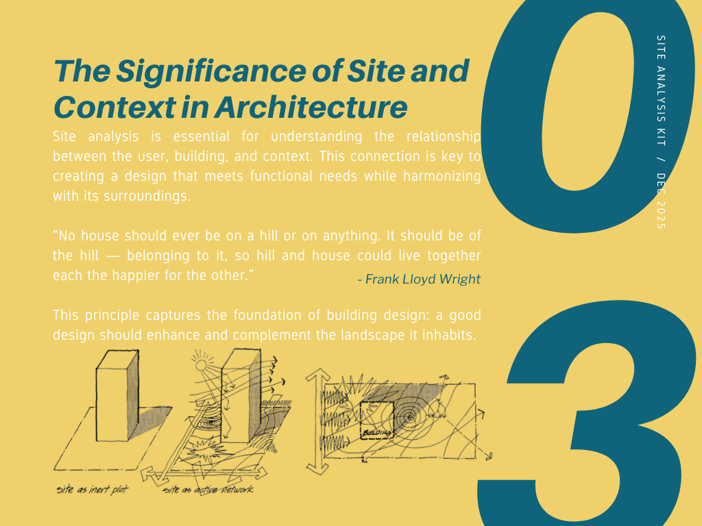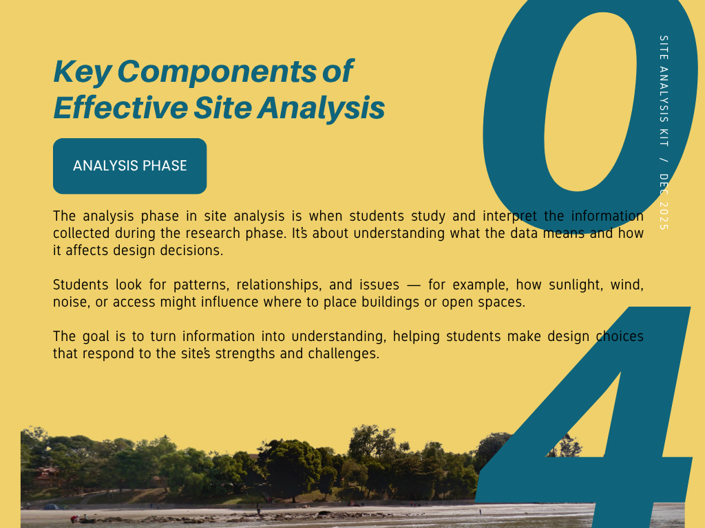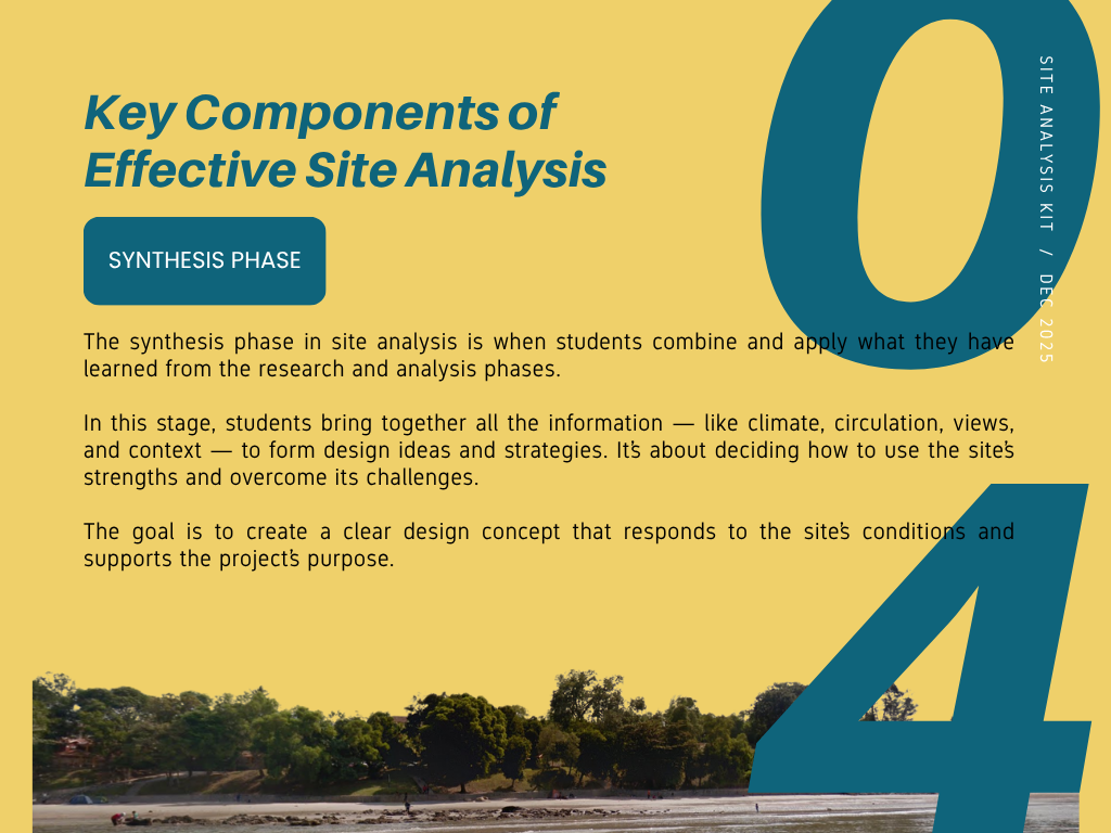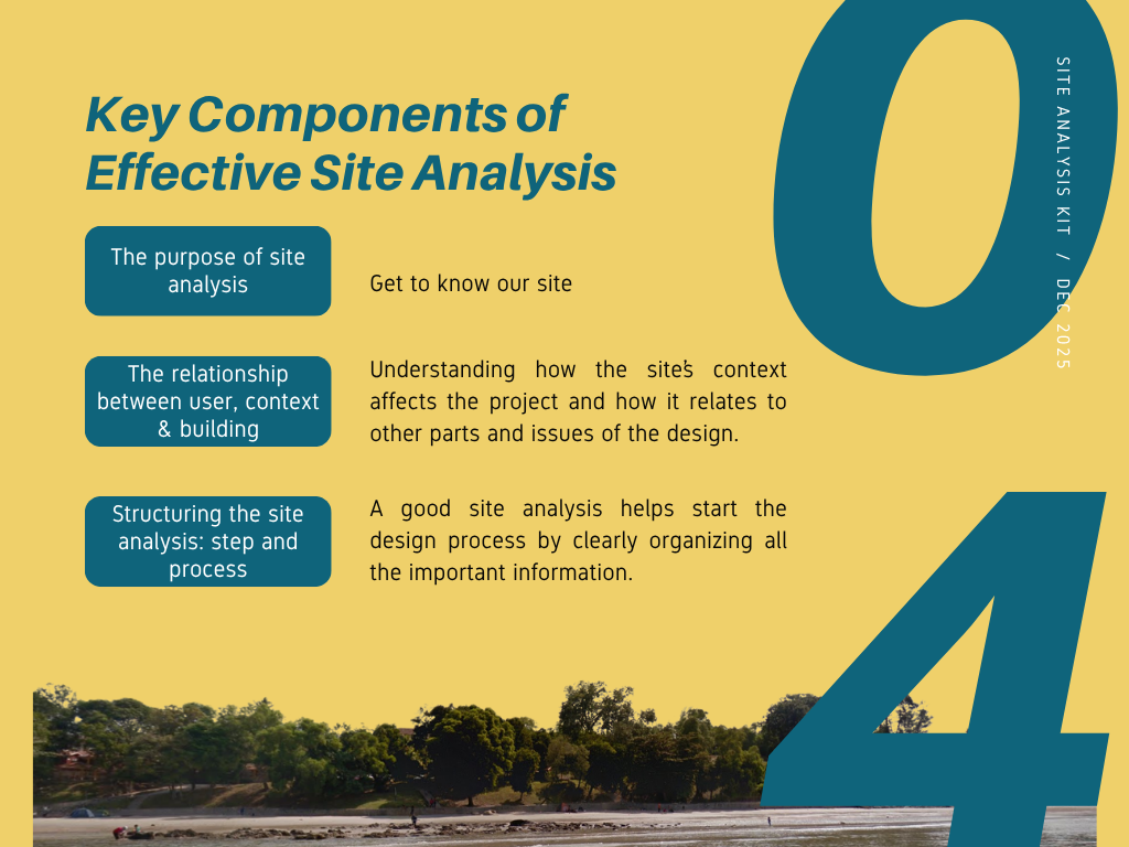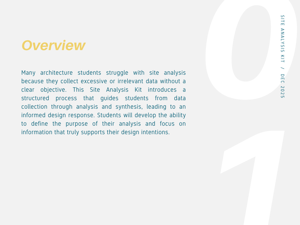 Many architecture students struggle with site analysis because they collect excessive or irrelevant data without a clear objective. This Site Analysis Kit is designed to guide learners through a focused, goal-oriented process for conducting effective site analysis.