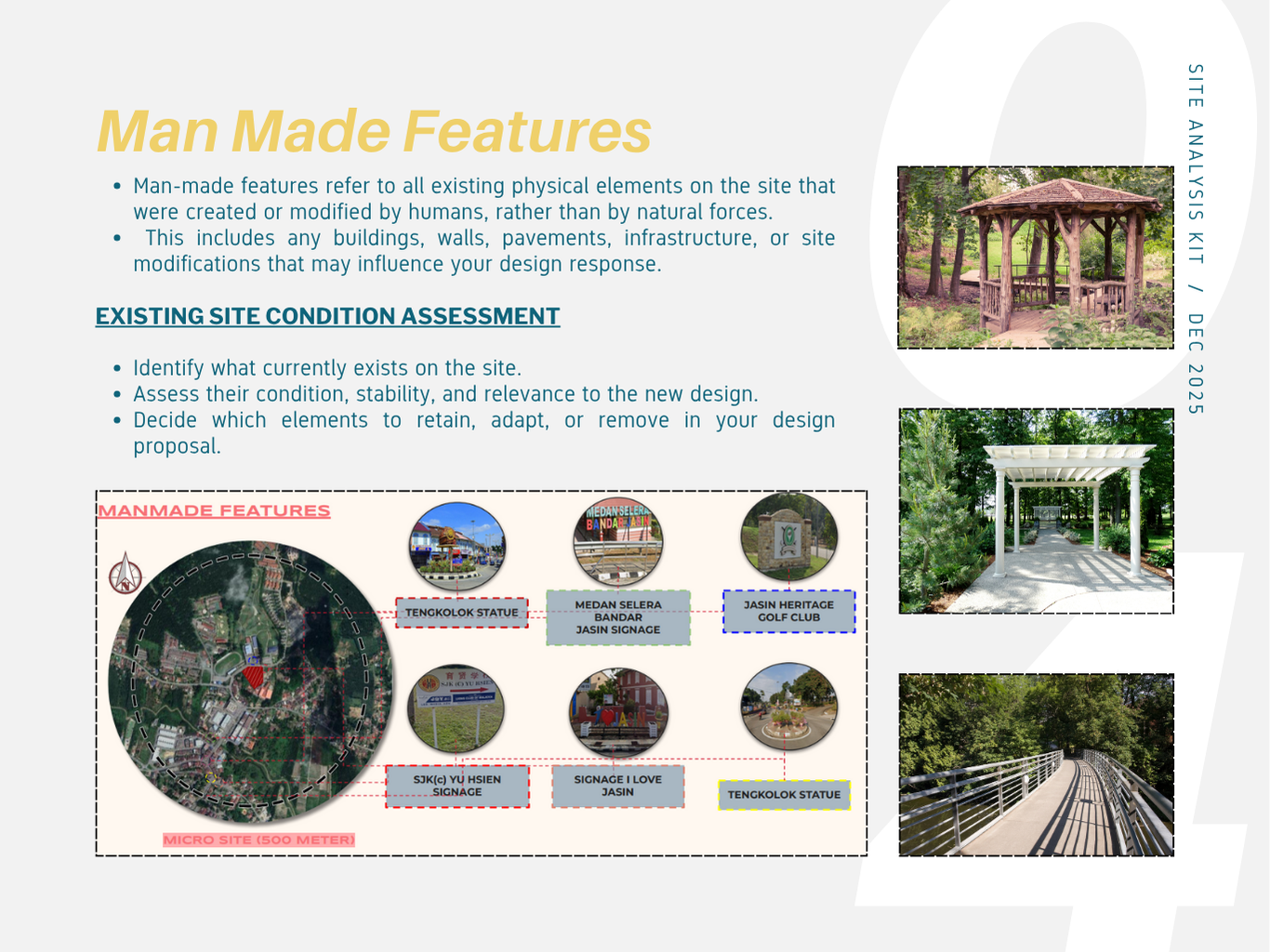 Before starting a design process, students must understand their site — its location, surroundings, rules, and natural features. This activity helps you explore your chosen site step by step and turn your findings into useful design ideas.You’ll look at key factors like where the site is, how big it is, what the land is used for, how people and vehicles move around, and what environmental features affect the site.By the end of this task, you should be able to collect and organize information, understand how different site factors affect design, and propose design ideas that respond to the site’s context.