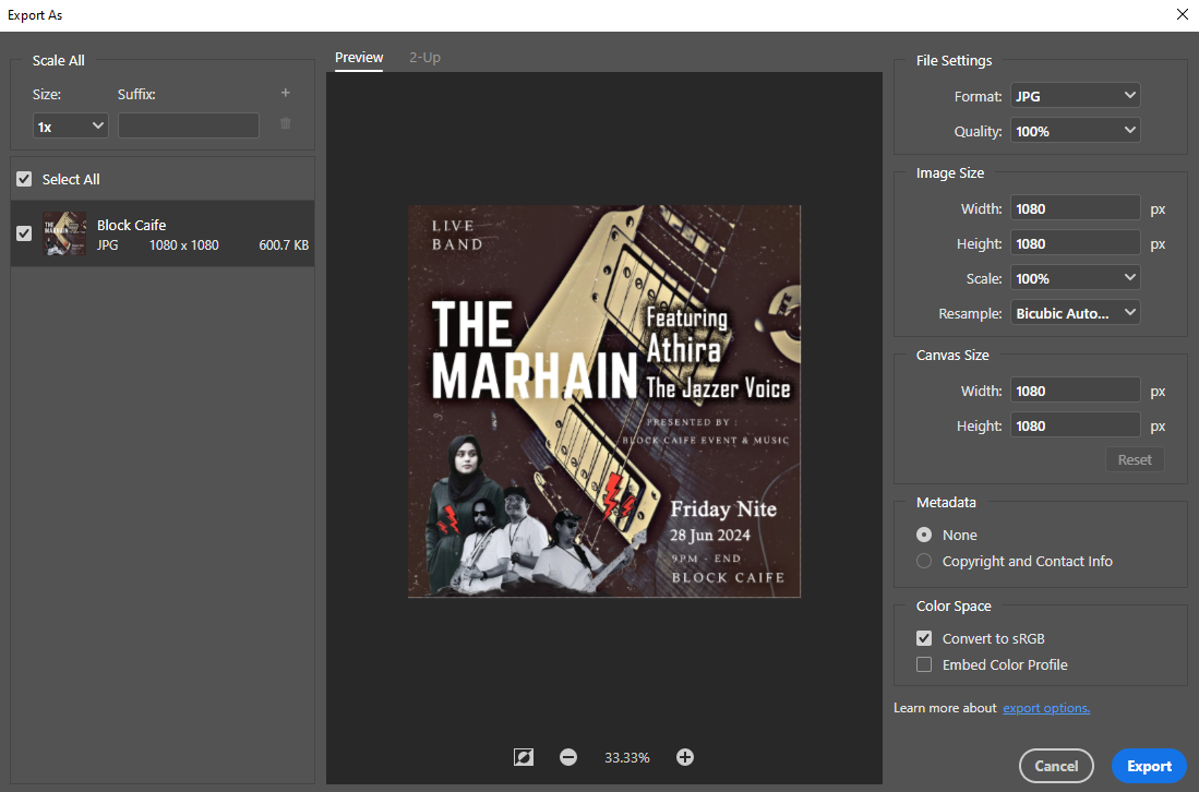 Choose the appropriate file format based on the specific requirements of your project, such as JPEG for the web or TIFF for print.